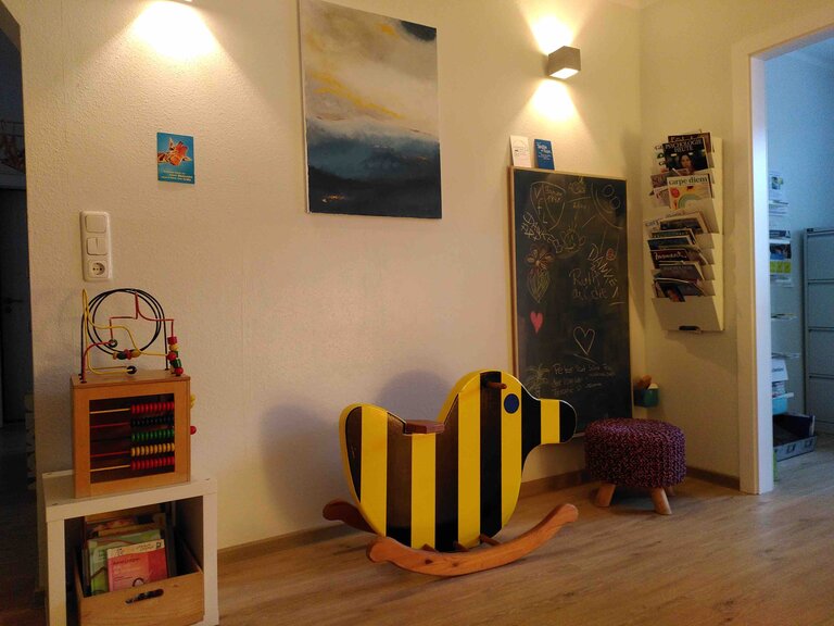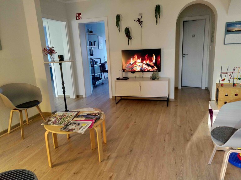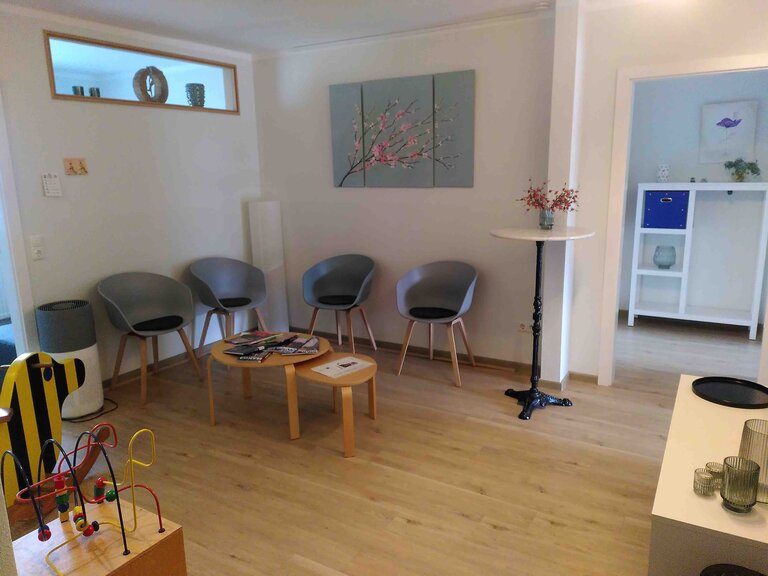 Wir arbeiten im 1. Stock eines Wohn- und Geschäftshauses. Ein Aufzug ist leider nicht vorhanden. Die Räumlichkeiten umfassen neben den einzelnen Behandlungsräume ein zentrales Büro, ein Wartebereich mit separater Stillecke, ein Gruppen- und Besprechungsraum, eine Teeküche, ein MitarbeiterInnen WC und ein PatientenInnen WC.